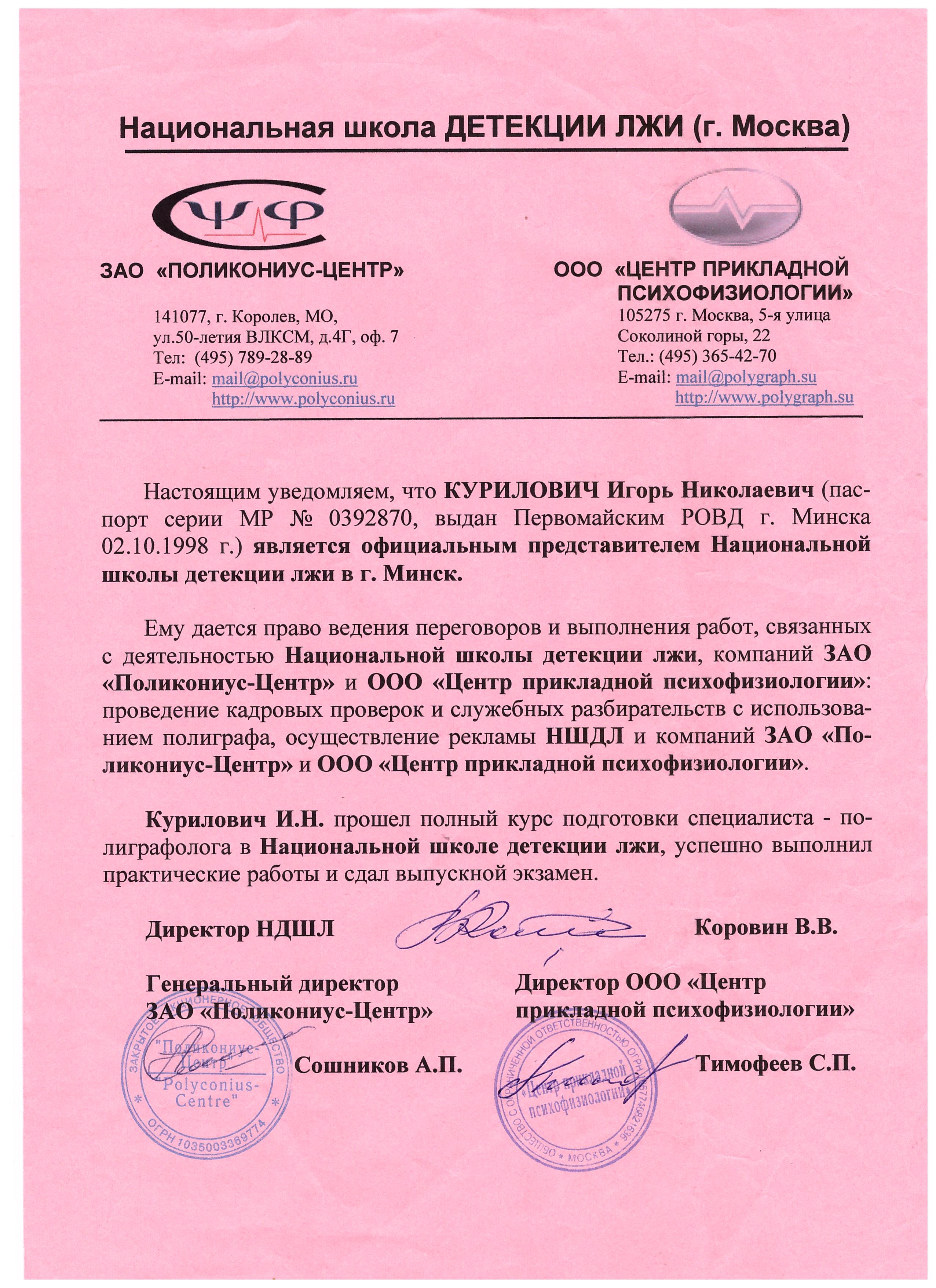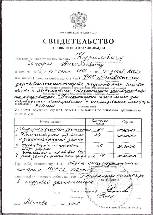 В 2006 году окончил Национальную школу детекции лжи (НДШЛ), являюсь ее официальным представителем.